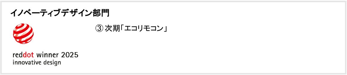TOTOはプロダクトデザイン部門において「シンラ」及び「RPシリーズ[Bidet(Back-to-Wall, Floor Standing)]」の2点が受賞、イノベーティブデザイン部門※1において次期「エコリモコン」が受賞し、計3点が受賞しました。なお、本賞を受賞した「シンラ」、「RPシリーズ[Bidet(Back-to-Wall, Floor Standing)]」、次期「エコリモコン」は、iFデザイン賞2025とのダブル受賞となります。