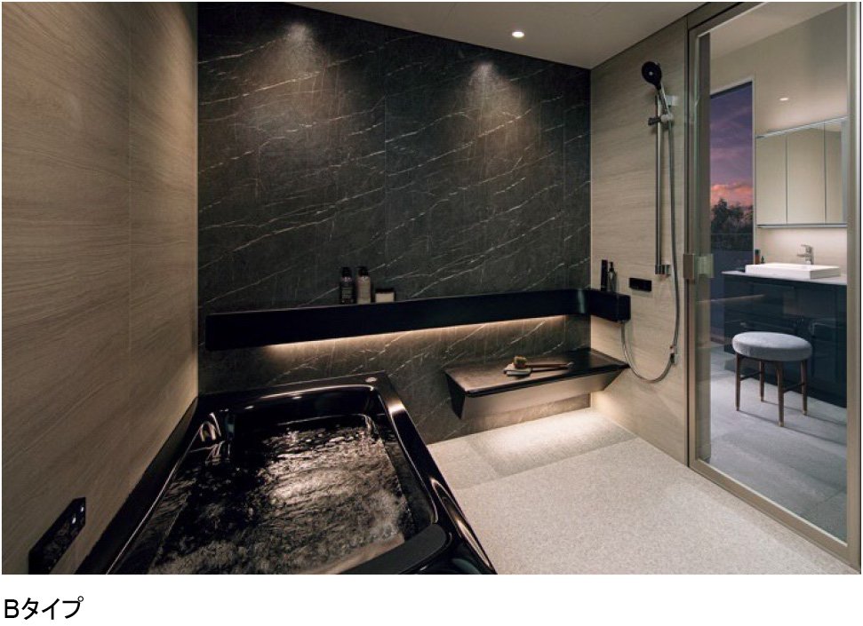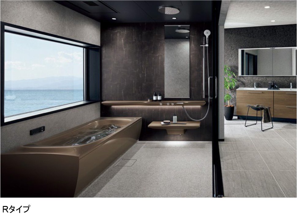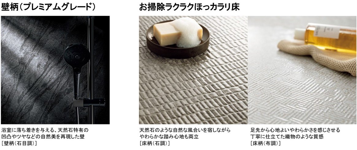 石や木の趣ある表情や独特な手ざわりに至るまで繊細に表現した壁柄や床柄が、浴室空間に飽くことのない奥深い魅力をもたらします。