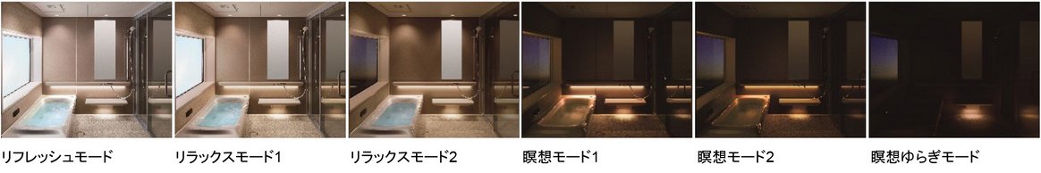 6つのモードが変わるごとに、点灯させる照明位置や色温度・明るさを変化させ、日の出から日没後のように1日の光を表現し、リフレッシュ・リラックスを感じる空間を演出します。