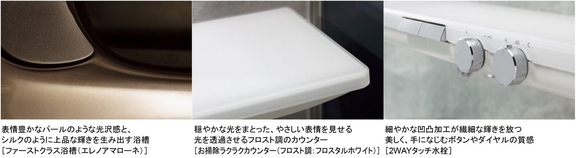 シンラの特長の一つである、自然のやさしさを感じる光を6つのモードで表現する「調光調色システム」。同システムが織りなすさまざまな光の状態に呼応すべく、浴槽やベンチ、湯量を調節するダイヤル、新たに自然の素材をモチーフにした床柄に進化した「お掃除ラクラクほっカラリ床」など、あらゆる部位の素材感にこだわりました。