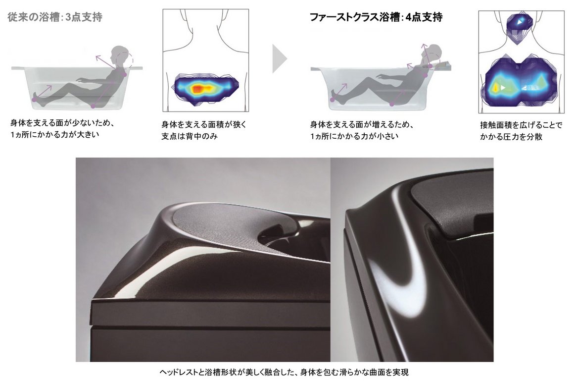 人間工学の研究をもとに身体を支える面を増やし、安定できる形を追求したファーストクラス浴槽。特長である4点支持形状には、従来の3点支持形状の浴槽にはなかった、枕のようなヘッドレストが必要でした。