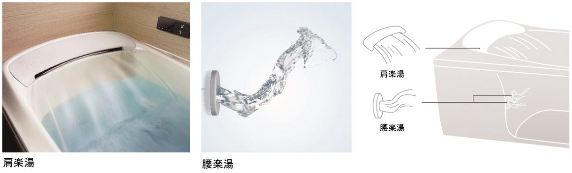 最大毎分約65Lのお湯を肩から浴びられる「肩楽湯」と、ジェットバス水流により腰を中心に変化に富んだ刺激を与える「腰楽湯」の2つの水流を同時に楽しむことができる「楽湯」。お風呂に入りながらリモコンで操作でき、お好みの使い方が可能です。使用するお湯は循環する方式のため、無駄なく経済的です。