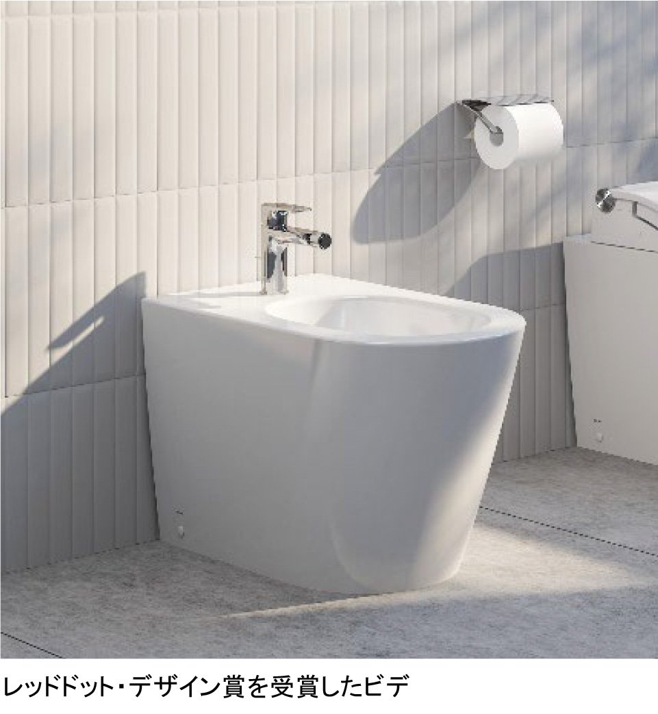 シンプルな直線と円弧を基調にデザインされた海外向けの便器・ビデ「RPシリーズ」。真上から見るとアルファベットの「D」の形に見えることから「Dシェイプ」と呼ばれています。レッドドット・デザイン賞2025では、同シリーズの床置きタイプのビデが受賞しました。
