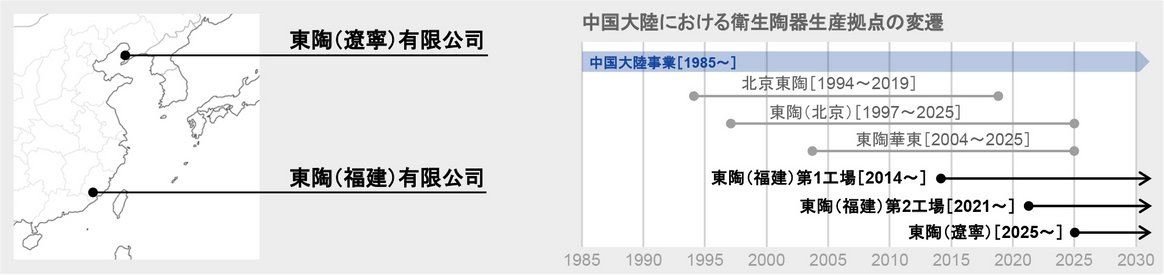 TOTOの中国大陸事業は、急速な市場変化への対応遅れに伴う業績悪化を踏まえ、同事業を立て直し、継続していくための構造改革を断行しています。構造改革の一つとして2025年4月、東陶機器(北京)有限公司(1997年稼働)および東陶華東有限公司(2004年稼働)での衛生陶器の生産を停止しました。今後は、東陶(遼寧)および東陶(福建)の2拠点体制で、中国大陸市場向けの衛生陶器を最新鋭の生産設備で生産・供給していきます。2拠点を合わせた生産能力は、約265万ピース※2/年となります。
