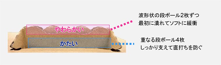 4枚の段ボールを波形状にして互い違いに重ねることで、重なる段ボールを2枚ずつにし、意図的に潰れやすくしました。それにより衝撃が加わると初めに潰れる2枚ずつの波形状が製品を柔らかく受け、その後は重なる4枚全ての段ボールでしっかり緩衝することができます。