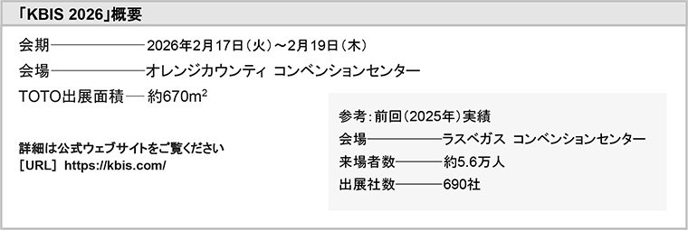 TOTO株式会社(本社:福岡県北九州市、社長:田村 信也)は、アメリカ合衆国フロリダ州オーランドで開催される北米最大の水まわり設備機器の国際見本市「Kitchen & Bath Industry Show(以下KBIS)2026」[会期=2026年2月17日(火)〜2月19日(木)、会場:オレンジカウンティ コンベンションセンター]へ出展します。TOTOは、1992年の初出展から今回で34回目の出展となります。