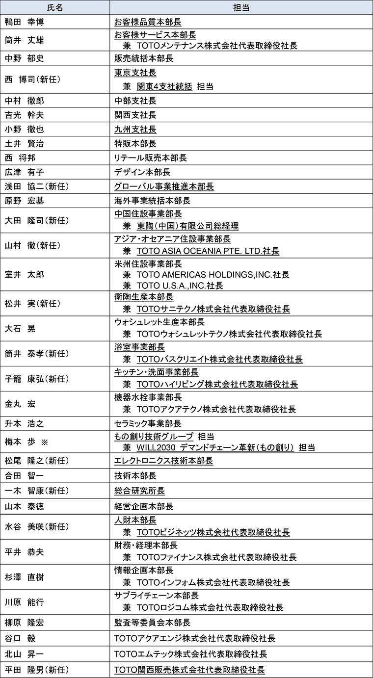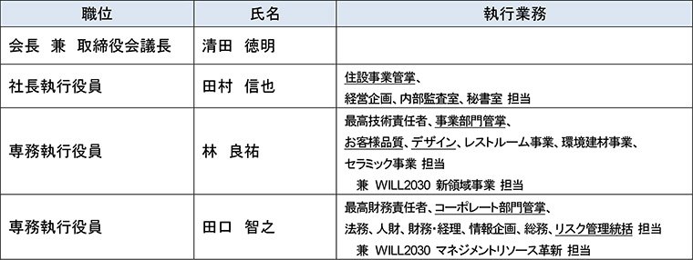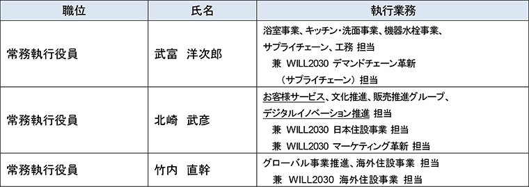 当社は、2030年に実現したい暮らしや社会・環境を明確化した「共通価値創造戦略 TOTO WILL2030」(以下、WILL2030)の実現に向け、2026年4月1日より新執行体制へ移行いたします。