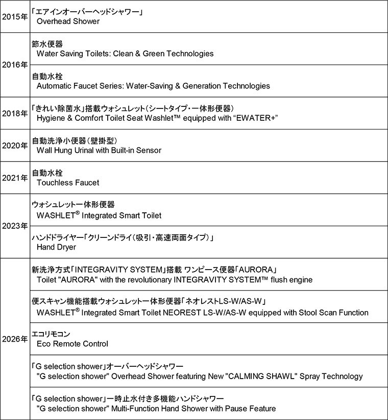 当賞は、持続可能な社会の実現に寄与するため、環境配慮に優れたデザインを評価することで世界中の人々の環境認識を高めることを目的とする国際的な環境賞です。専門の審査員により政府、企業や組織、建築家、デザイナーなどの個人、個々の製品、建物、技術などに与えられます。今回の受賞では、TOTOが有する環境に配慮した最先端の技術や、健康・快適という新たな価値の創造、そしてものづくりに真摯に取り組む姿勢が高く評価されました。当賞の受賞は7回目、計13商品となります。