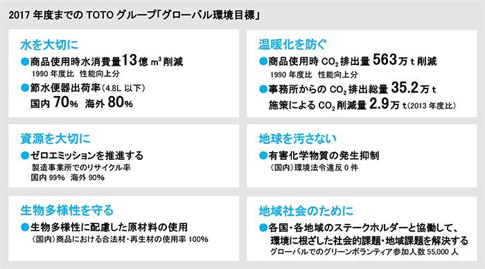 この「TOTOグローバル環境ビジョン」実現に向け、グローバル共通で取り組む2017年度までの目標「グローバル環境目標」を設定しています。水に大きく関わってきた企業として「水環境の保全(水を大切に)」を軸に、6つのテーマそれぞれで目指す目標を明確に定め、取り組んでいます。
