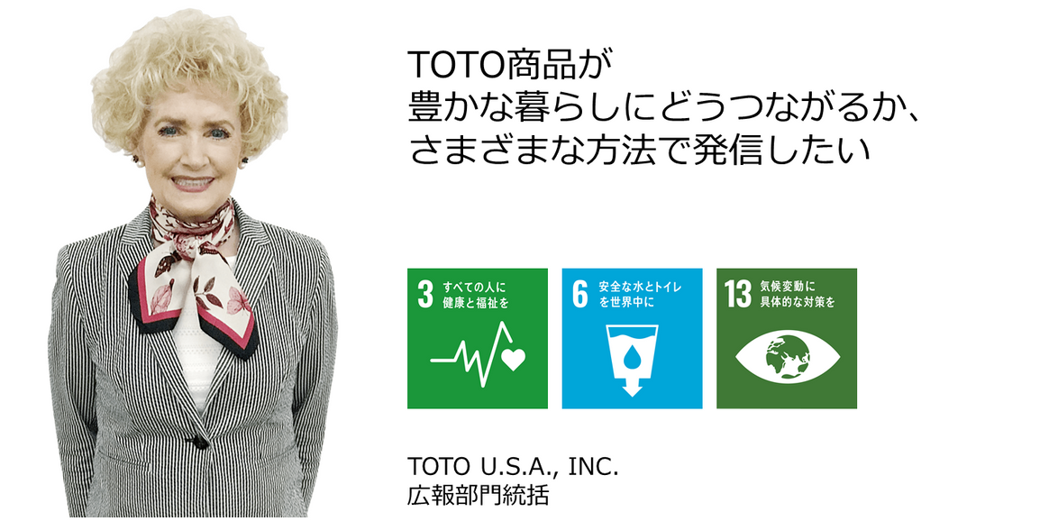 節水商品を知っていただくことはゴール6「安全な水とトイレを世界中に」、ゴール13「気候変動に具体的な対策を」への貢献につながります。北米の消費者の多くは、「社会や地球のために貢献している企業から製品を購入したい」という考えを持っています。そこで、私が担当するブランド認知キャンペーンなどにおいてもTOTOの 「ユニバーサルデザイン5原則」やSDGs貢献を積極的に織り交ぜるようにしています。そのことはゴール3「すべての人に健康と福祉を」にもつながります。これらのことから、より多くの北米のお客様が「環境への責任と水資源の保護に基づいた清潔で快適なライフスタイルを実現する」というTOTOの重要な役割を理解してくれています。