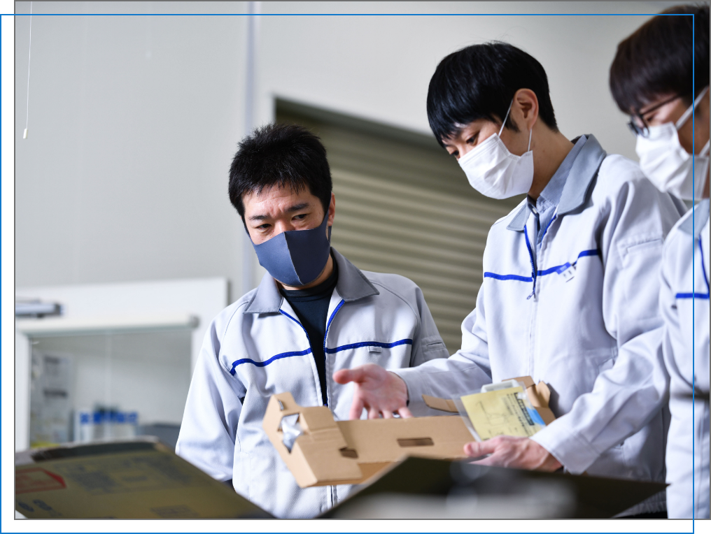苦労の末にアイデアを形にし、より良い包装材となって世界中のお客様へ無事商品をお届けできることは、まるで自分が世界中を飛び回っているようなやりがいを感じます。以前、海外の厳しい輸送環境に対応するために、段ボールを折り重ねることでバネのように復元する緩衝仕切を開発しました。段ボールは一度潰れると元に戻らない弱点があるので、発泡スチロールを使うしかないのではという意見も出ていましたが、あきらめることなく段ボールの可能性に挑戦して実現させることができました。今は新商品用に、新たな段ボール緩衝仕切を開発中です。発売されるのがとても待ち遠しいですね。