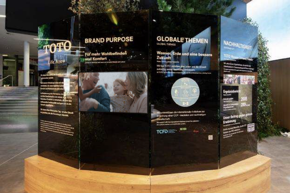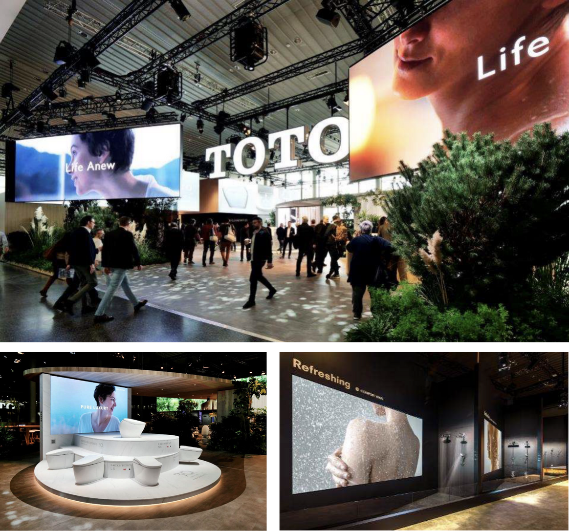 ISHは、ドイツ・フランクフルトで2年に1回開催されるバス・トイレ・ビルディング・冷暖房・空調・再生可能エネルギーの世界最大規模の国際見本市で、水まわり商品などの発信源として世界的に注目されています。TOTOが出展するのは今年で8回目ですが、世界中にTOTOファンを増やしていくことを目指している私たちにとって、ISHはブランドと商品を広く知っていただくための、きわめて重要な機会です。今回はISH2023の開催テーマ “Solutions for a sustainable future”の下、当社の「サステナブルプロダクツ」と称した商品群を数多く展示し、水まわりから環境に貢献するTOTOグループの存在意義を発信しました。TOTOのサステナブルプロダクツは、「きれいと快適」と「環境」を両立する商品です。例えばトイレなら、節水しながら汚れをしっかり流しきるという高い洗浄力が特長です。シャワーは吐水方法を工夫することで、少ない水量でも快適な浴び心地を実現しています。今回のISHでは、こうした強みを会場で体感いただけるよう、大掛かりなインスタレーションや通水実演を用いてアピールしました。さらに外光や本物の植栽を豊かに配した展示デザインで、コーポレートメッセージである「Life Anew※」を印象づけました。