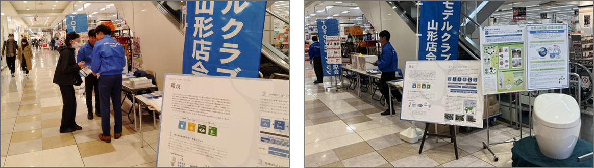 2023年10月、イオン山形北店において、TOTOグループのマテリアリティ「環境」に関する活動やSDGsへの貢献を周知するパネル展示を行いました。普段、我々がお客様と接するときは製品を通じた会話が中心ですが、今回のイベントではTOTOリモデルクラブ山形店会やあんしんリモデルの取り組みに関するご案内とともに、TOTOの環境貢献に取り組む姿勢もしっかりとお伝えし、これまでリモデルクラブ山形店会が行っていたものとは大きく異なるイベントとなりました。