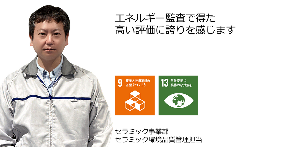 さらに、顧客の環境意識が高まっている今、ESG調査や環境監査への対応も重要な取り組みになっています。2024年度上期にはセラミック事業部で初めて、顧客によるエネルギー監査を受けました。全社でもこうした監査の前例がなかったため手探りの対応でしたが、その外資系最大顧客の窓口であるTOTO U.S.A.の営業チームや工務部門と連携し、エネルギー効率の改善やCO₂排出削減に対する真摯な取り組みをお見せすることができました。こうした監査対応で顧客との信頼関係を築き、生産技術や製品のイノベーションを促すことは、SDGsゴール9「産業と技術革新の基盤をつくろう」にもつながっていると思います。