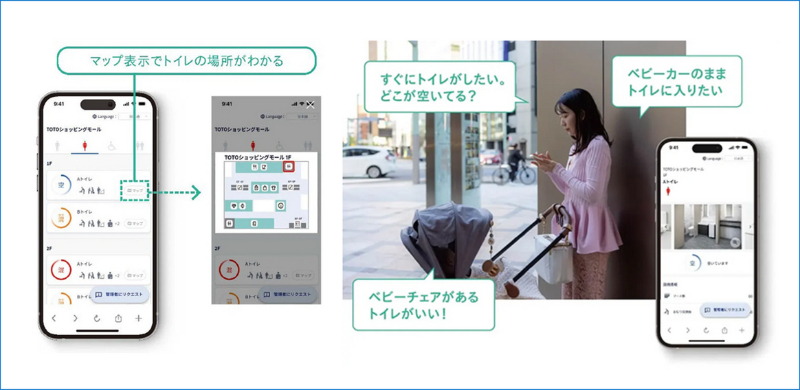 トイレの利用者は、スマートフォンで二次元コードを読み取るだけでトイレの混雑状況が分かり、ベビーチェアの有無や車いすで利用できるトイレを探すこともできます。また、汚れや故障などの異常に気付いた際には、管理者や清掃担当者に対して、スマホから修理や清掃を依頼できる機能もあり、お子様連れや高齢者の方々からは「安心してトイレを利用できる」と非常に好評です。また、利用状況や利用者の困りごとを即座に可視化し、迅速で的確な対応につながることから、利用者だけでなく、設備管理者の方々からも高く評価いただいています。