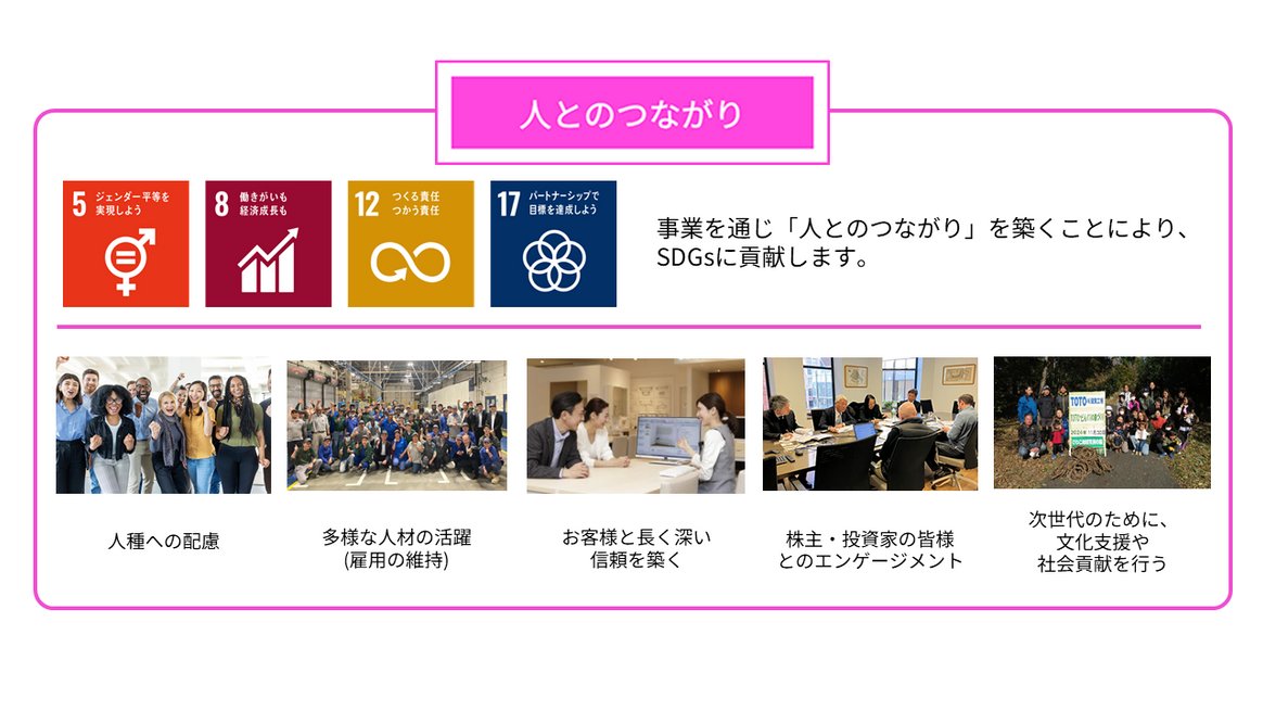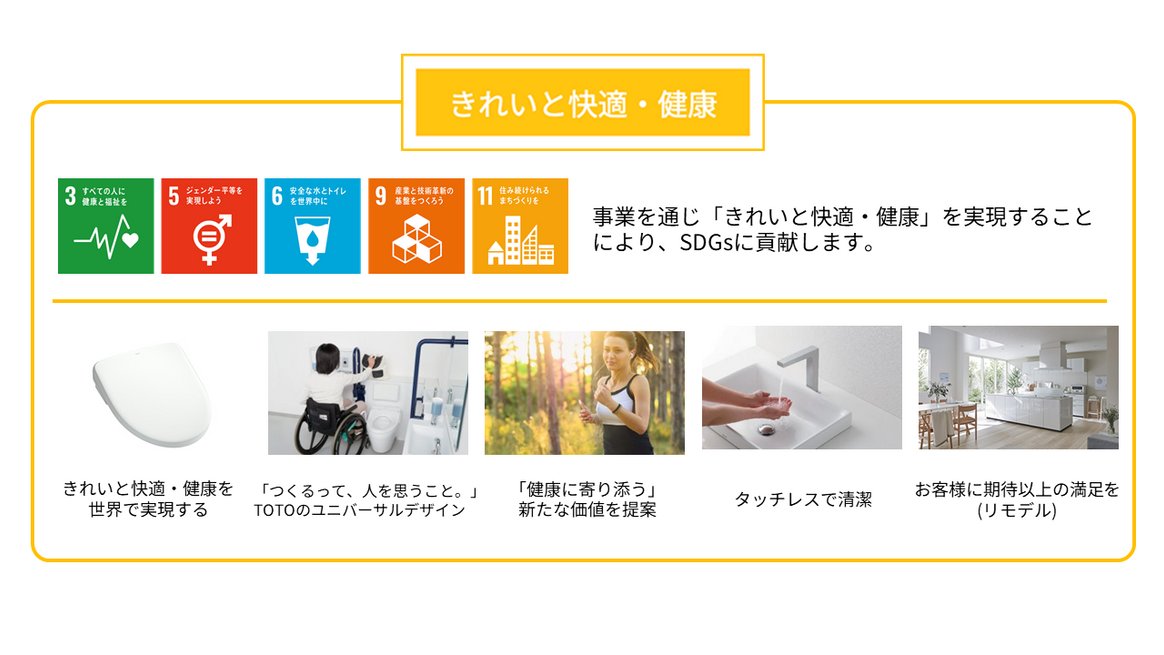 こうしたTOTOの事業や活動を、SDGs視点から詳しく見ていきたいところですが、今回はひとまずここまで。次はTOTOのマテリアリティ「きれいと快適・健康」「環境」「⼈とのつながり」に沿って具体的なTOTOの取り組みをご紹介していきたいと思います!