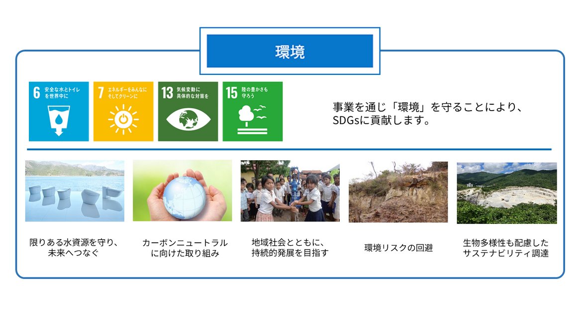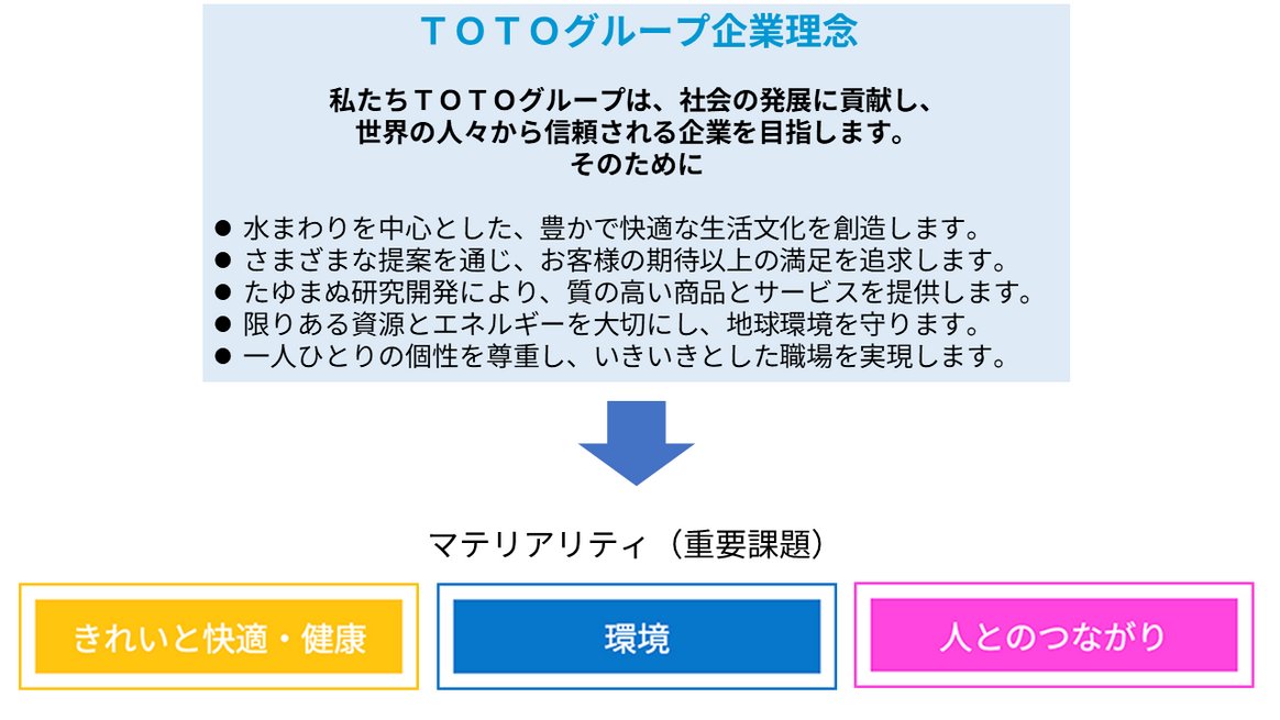 創⽴者のそうした志は「TOTO グループ企業理念」として脈々と受け継がれ、この先も私たちが全社⼀丸で⽬指している姿を指し⽰しています。マテリアリティ「きれいと快適・健康」「環境」「⼈とのつながり」は、それを実現していくにあたり取り組むべき重要課題です。マテリアリティへの取り組みは、現在のSDGs の⽬標達成にもつながっています。
