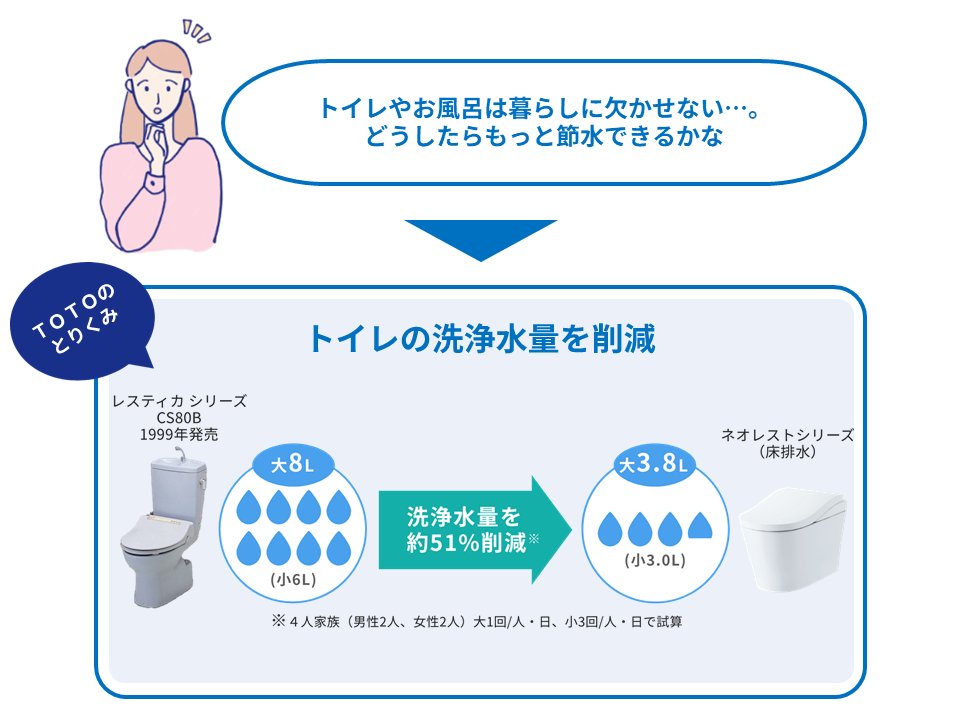 毎日繰り返し使うトイレは、少量の節水でも大きな効果につながります。でも、我慢するだけの節水は続きません。そこでTOTOは、素材となる陶器の焼成技術を高め、汚れにくくてお掃除しやすい便器を開発。少ない水でもしっかり流して、きれいを保ちます。現在「ネオレスト」では、1回あたりの洗浄水量がわずか3.8Lと大幅な節水を実現しました。