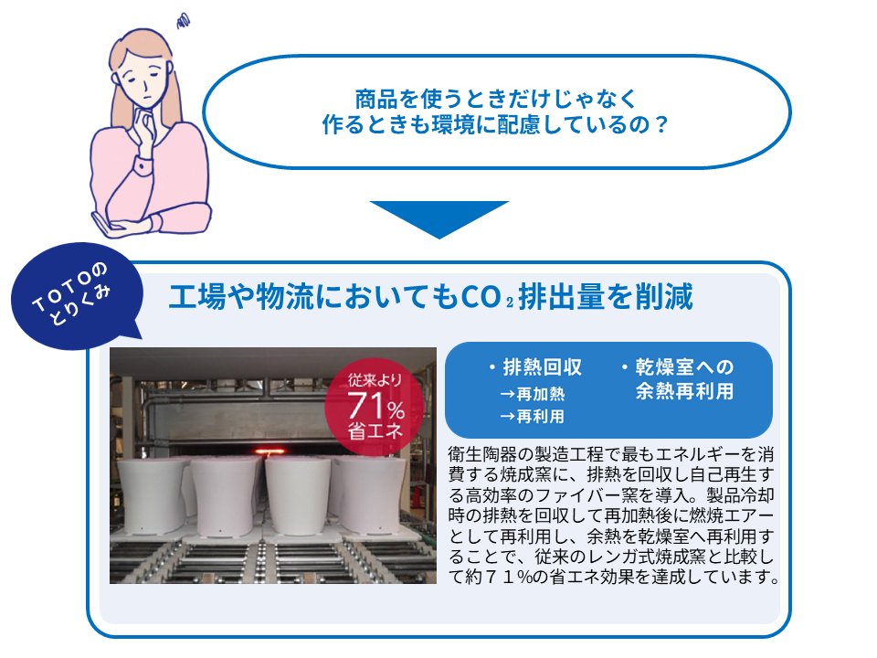工場では、さまざまな省エネ活動や太陽光発電の導入はもちろん、陶器を焼くための燃料をCO₂排出量の少ないものに変更したり、その排熱を回収して素材の乾燥などに利用する、高効率な窯を導入してCO₂排出量の削減を行っています。また物流においては、輸送燃料の削減につながる、積載効率の向上・共同配送など、輸送会社様、販売パートナー様と連携した輸送の効率化に取り組んでいます。商品を使うときだけではなく、さまざまな場面でCO₂排出量の削減に取り組んでいます。