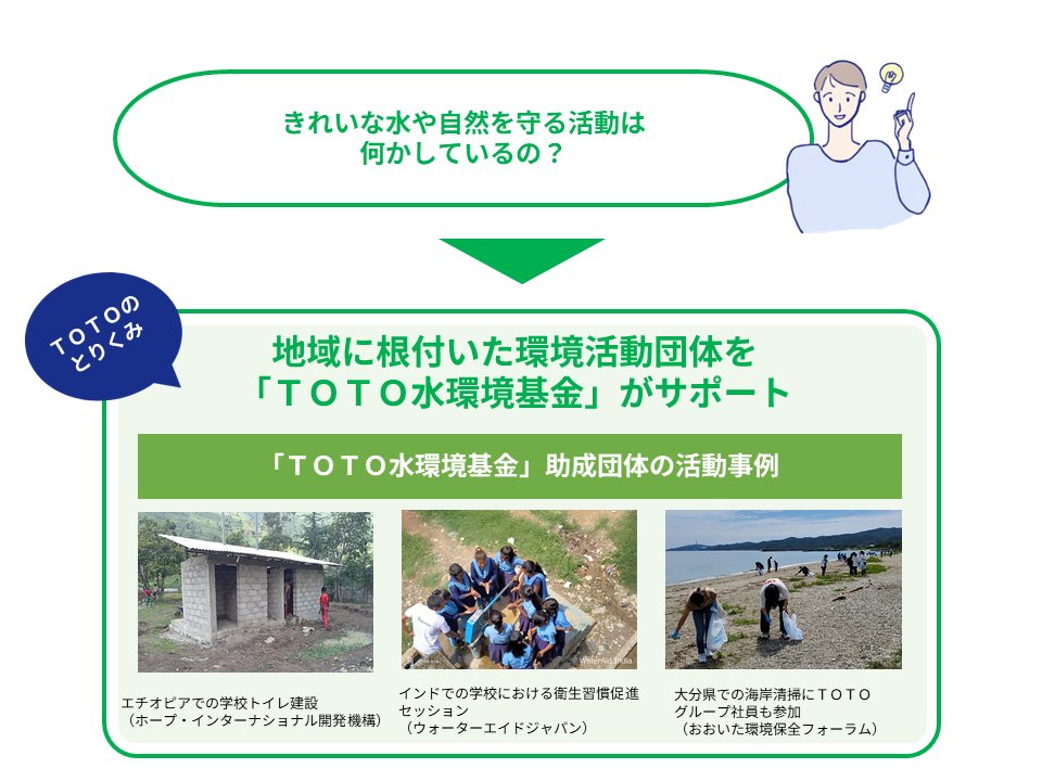 TOTOグループは2005年に、環境保全や衛生的で快適な生活環境づくりを行っている団体の活動を支援する「TOTO水環境基金」を設立しました。地域社会が持続的に発展していくためには、その地域の住民による活動が不可欠です。一時的な物資や資金援助ではなく、地域で継続的に活動を続ける団体を助成することで、地域に根付いた持続的な環境活動を支援しています。