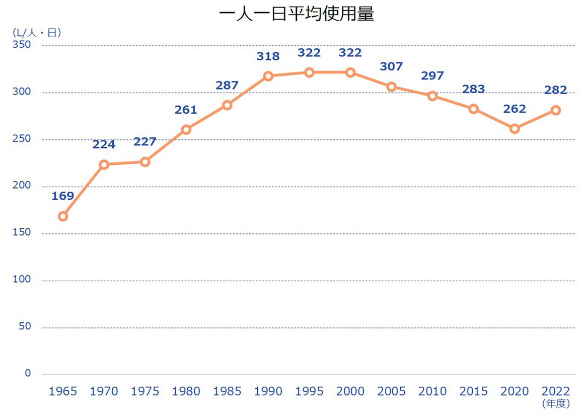 日本人の一人一日平均の生活用水使用量(都市活動用水を含む)は、2022年度は282L/人・日となっており、近年はおおむね横ばい傾向にあります。