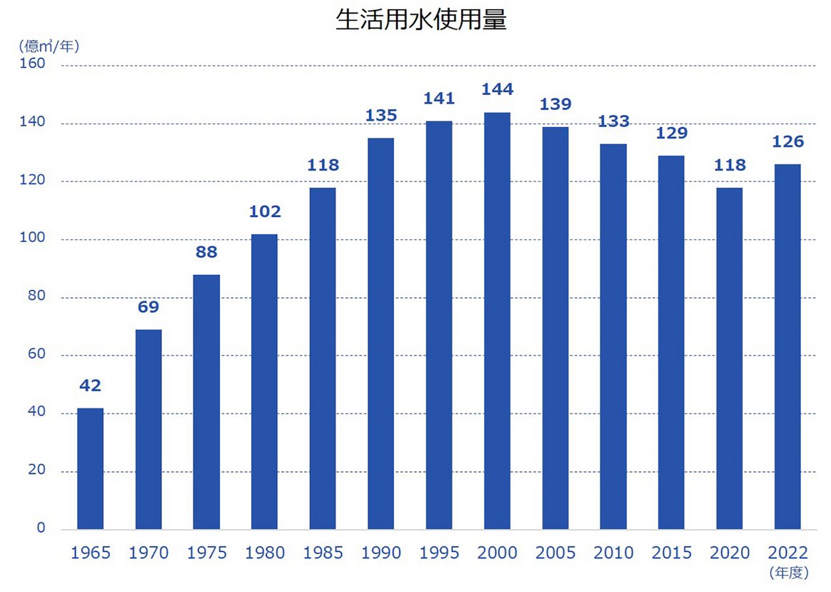 2022年度の日本での生活用水使用量は、有効水量ベースで約 126.4 億 m3/年となっています。生活用水使用量は、1998 年頃をピークに緩やかな減少傾向にありますが、それでも多くの水を日本全体で利用しています。