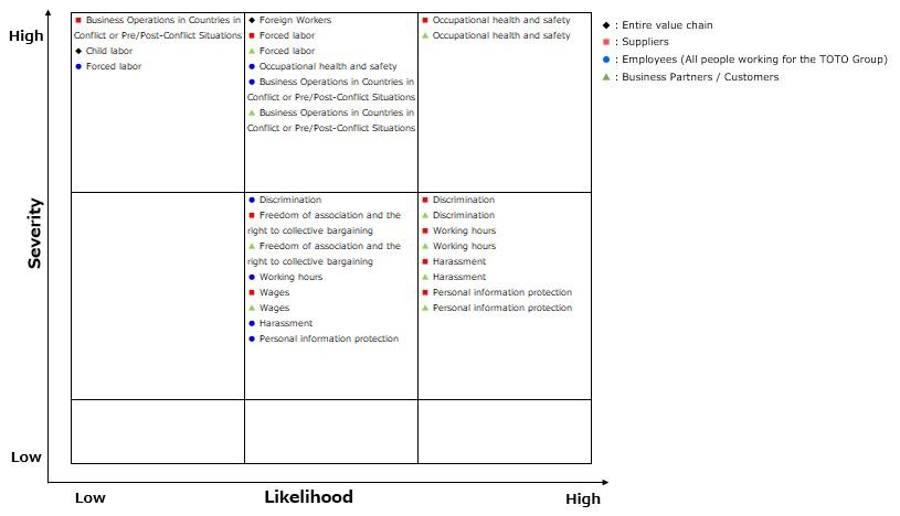 ・For items with high human rights-related risks, consider the following factors: comparison with second opinions from specialist organizations, relevance to the important human rights-related issues specified in the Idea Concerning the TOTO Group Human Rights Policy, interview surveys with some departments and Group companies, and strength of connection to our business. Then, identify areas/issues where human rights issues are likely to arise, which therefore have a high priority for action.