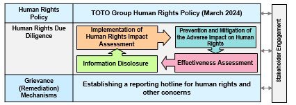 In accordance with the TOTO Group Human Rights Policy established in fiscal 2023, the Group promotes human rights due diligence to identify, prevent and mitigate the adverse impact of its business activities on human rights throughout its value chain. The Group identifies human rights-related risks in its business activities and implements initiatives to prevent and mitigate their adverse effects, verifying their effectiveness. It also discloses information on these initiatives to respect human rights in the integrated report and on the TOTO website.