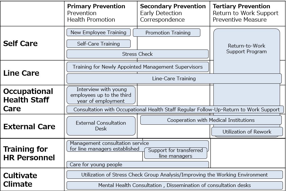 | ② Training at the time of promotion | ・Persons who have been promoted to employee qualifications for general employees ・Persons who have been promoted from general employee qualifications to managerial positions | ・General employee ⇒ self-care ・High-ranking general employees and Managers ⇒ self-care + line care | |