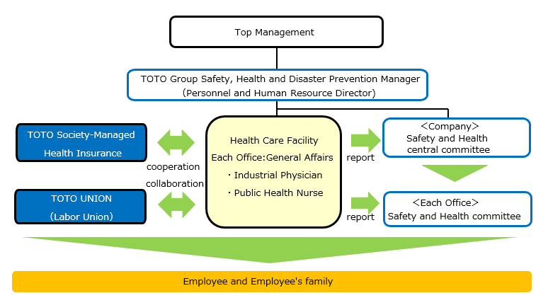 The TOTO Group endeavors to improve the health management and heath literacy of our employees and their families under the supervision of the president and representative director, the direction of the director in charge of personnel and labor issues, and the leadership of the health care center at each site and the general affairs division of each business site.
