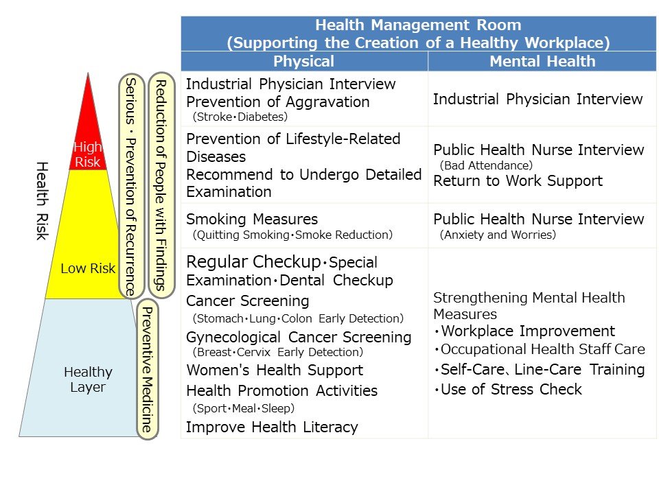 For employees in which anomalies were observed through a regular medical checkup and those with mental health disorders or receiving medical treatment for diseases, we work on the prevention of worsening and recurrences. We also stratify health risks and deploy measures by level by promoting the prevention of lifestyle-related diseases so that healthy employees do not turn to those subject to health management support in the future.