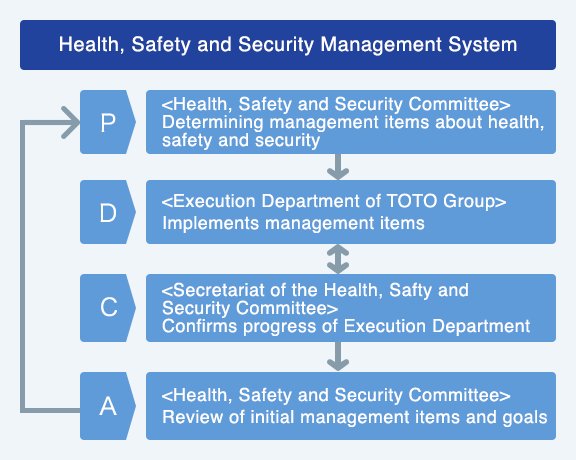 TOTO Group reflects the comprehensive objectives of the ILO Guidelines, in accordance with the Ministry of Health, Labor and Welfare's Industrial Safety and Health Management System Policy as the Health, Safety and Security Management System functions throughout the entire TOTO Group. This is an activity to expand the health, safety and security activities based on the TOTO Group Corporate Behavior Policy throughout the TOTO Group and to repeat the PDCA cycle to achieve the goals.