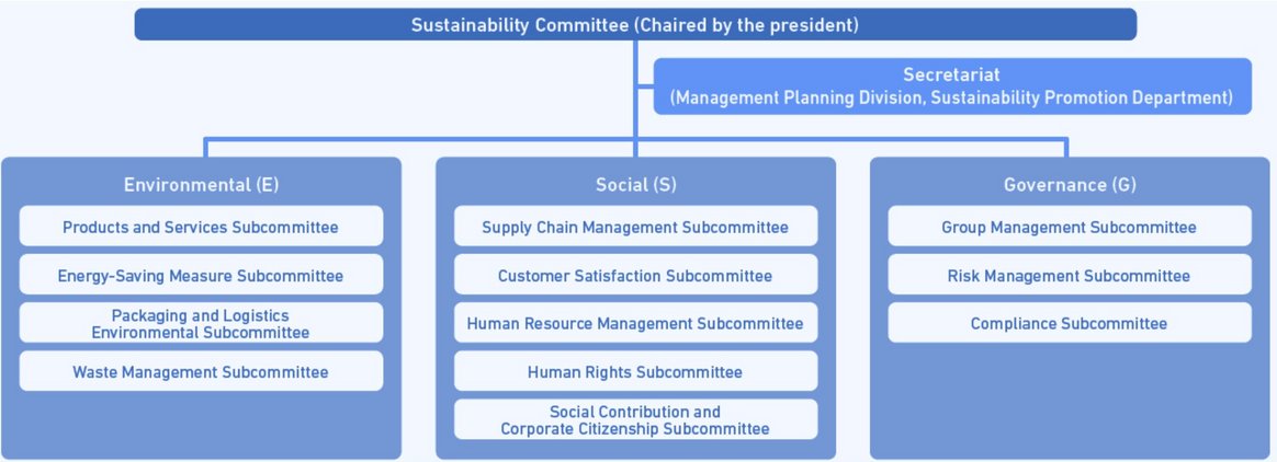 We established the CSR Committee and the specialized CSR department and started CSR activities in 2004. In fiscal 2023, the name was changed to the "Sustainability Committee". The Sustainability Committee is held three times a year with the president as the chairperson and by supervising and commanding a bird's-eye view of the three fields—environment, social, and governance— to work on sustainability management. At the Sustainability Committee, sustainability issues and materiality that includes climate change are discussed, and activity plans are developed, and each subcommittee in charge develops promotion plans, deploys them to the relevant divisions and Group companies at home and abroad, and conducts cross-divisional activities.