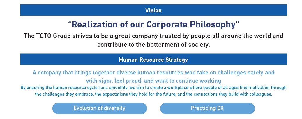 We refer to all the people working at TOTO as human assets rather than human resources because we believe they are the source of value creation and valuable assets for creating the next generation. We aim to realize our Corporate Philosophy by creating an environment where all generations can take on challenges by thoroughly utilizing a human resource cycle for individual autonomy and growth.