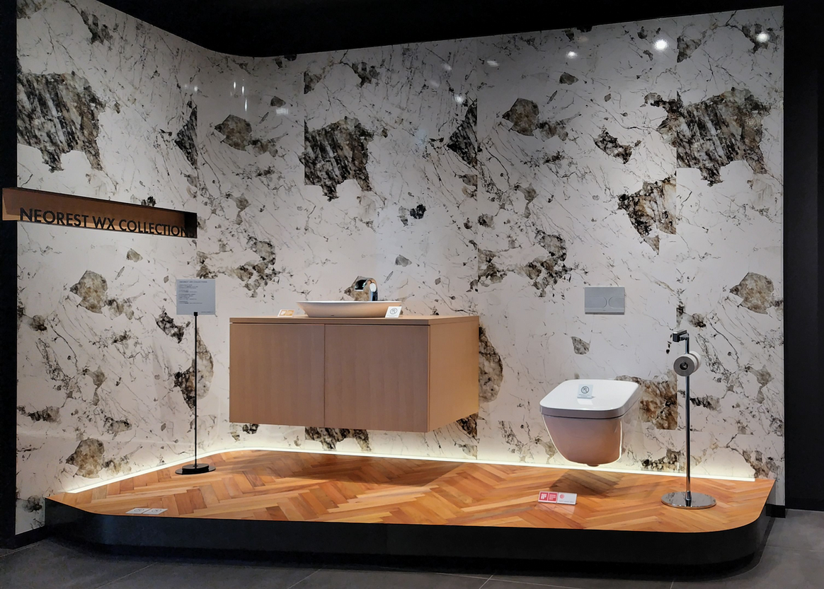 壁掛式便器の最高峰であるネオレストWXを中心とした、ラグジュアリーなレストルーム空間を再現しております。