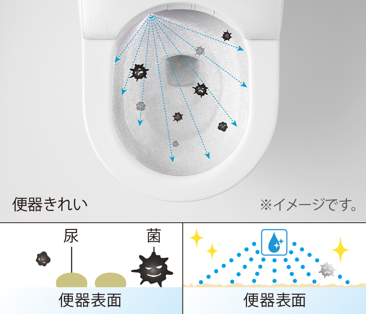 「きれい除菌水」でノズルを除菌する技術を応用したのが「便器きれい」です。使うたびに便器のボウル面を自動で除菌し、いつでもきれいを保つことができます。