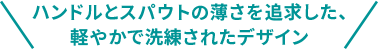 最小限の薄さで成形したスパウトと ハンドル。軽やかさと柔らかさを表現しています。 |