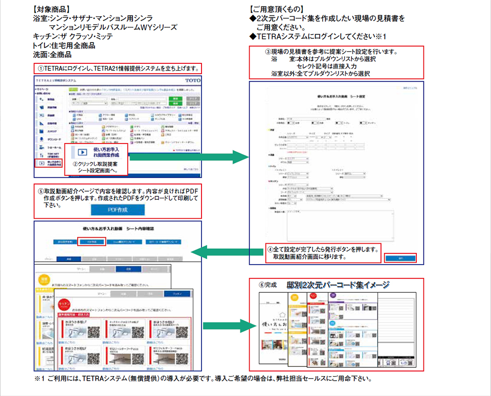 2021年8月2日に住宅向け使い方&お手入れ動画を邸別にまとめたバーコード集を作成できるサイトをリリースします。TETRAをご利用のパートナー様・お得意様は、TETRA情報提供画面から同サイトをご利用頂けます。 「邸別使い方&お手入れ動画集」をご活用頂き、お客様サービス向上にご利用下さい。 |