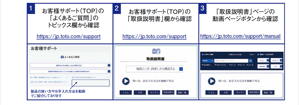 2021年8月2日より、TOTOホームページの「お客様サポート」内に「使い方&お手入れ動画ページ」を開設致します。 TOTO商品をご採用頂いておりますお客様にご案内をお願い致します。