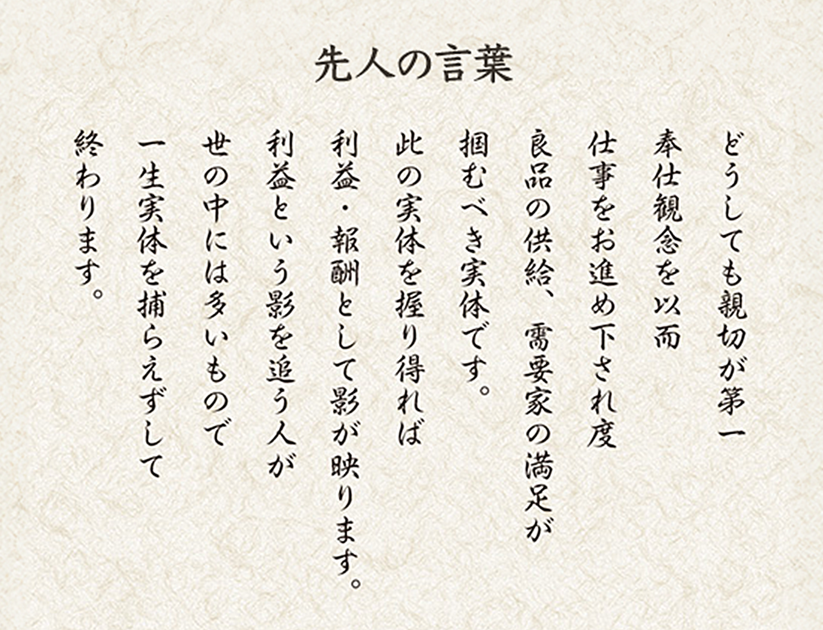 その中の「どうしても親切が第一、良品の供給、需要家の満足が掴むべき実体で、その実体を握り得れば、結果として利益・報酬という影が映る」という考え方を