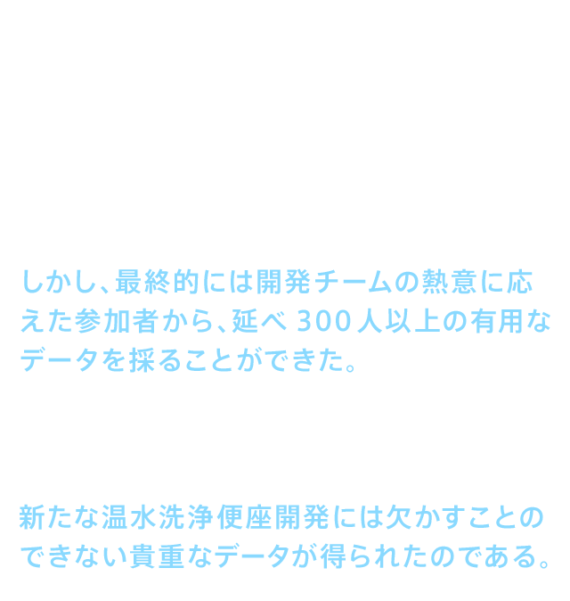 • こうしたデータを得るために開発チームは社内に働きかけ、協力者を募った。だが、いかに自社の新商品開発のための貴重なデータとはいえ、デリケートな部位であるおしりへの実験はさすがに抵抗感が大きく、特に女性社員の協力を得ることは容易ではなかった。しかし、最終的には開発チームの熱意に応えた参加者から、延べ300人以上の有用なデータを採ることができた。その結果、洗浄する温水は38℃、便座の温度は36℃、乾燥のための温風は50℃、ノズルから噴出する洗浄水の吐水角度は43度といった、新たな温水洗浄便座開発には欠かすことのできない貴重なデータが得られたのである。