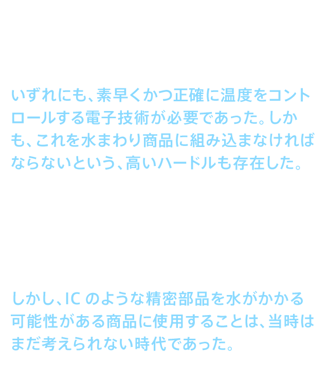 • 新しい温水洗浄便座には、温水洗浄と温風による乾燥、そして暖房便座の3つが基本機能として求められていた。いずれにも、素早くかつ正確に温度をコントロールする電子技術が必要であった。しかも、これを水まわり商品に組み込まなければならないという、高いハードルも存在した。もっとも難関だったのは、適温を維持するために温度の変化を素早く正確に感知し、必要な制御を即座に行う技術だった。この難しい問題に対して担当者が導き出した答えは、ICによる制御であった。しかし、ICのような精密部品を水がかかる可能性がある商品に使用することは、当時はまだ考えられない時代であった。