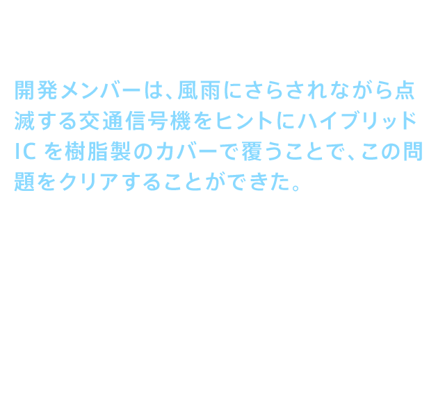 • この問題を解決したのが、特殊な樹脂でICをコーティングした「ハイブリッドIC」だった。開発メンバーは、風雨にさらされながら点滅する交通信号機をヒントにハイブリッドICを樹脂製のカバーで覆うことで、この問題をクリアすることができた。さらにサーミスタ(thermistor:温度の変化により、抵抗値が変化する電子部品)を用いることで、よりきめ細かな温度制御を実現した。こうしていくつものハードルをクリアして誕生した記念すべき新商品が「ウォシュレット®G」である。最先端の知識と技術を駆使して完成させたのであった。