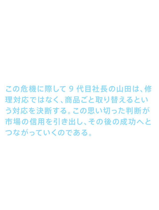 • 1980年6月、ウォシュレット®の販売が始まった。販売は好調で、販売直後から品不足になるほどだった。こうして好調なスタートを切ったウォシュレット®であったが、発売から3カ月が経ったころ、突然「温水が水に変わる」というクレームが多数寄せられるようになる。この危機に際して9代目社長山田は、修理対応ではなく、商品ごと取り替えるという対応を決断する。この思い切った判断が市場の信用を引き出し、その後の成功へとつながっていくのである。発売から2年後の1982(昭和57)年には、今も多くの人の記憶に残るコピー「おしりだって、洗ってほしい。」とともに全国に放映されたテレビCMが大きな話題となる。「拭く」から「洗う」という新しいトイレ文化とともに、ウォシュレット®の販売は拡大していった。