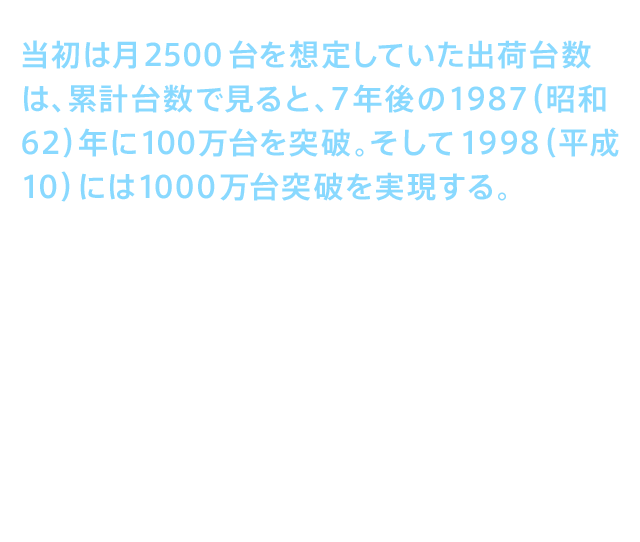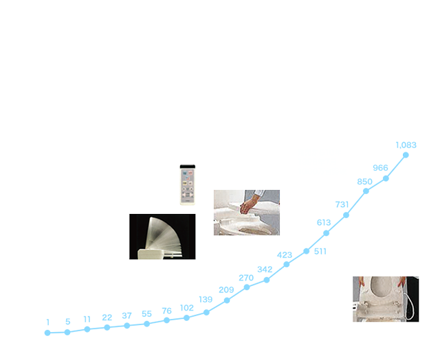 • 当初は月2500台を想定していた出荷台数は、累計台数で見ると、7年後の1987(昭和62)年に100万台を突破。そして1998(平成10)には1000万台突破を実現する。販売が順調に進む一方、機能についても、洗浄、乾燥、暖房便座という3つの基本性を基盤としながら、清潔性を高めたセルフクリーニング機構、快適性を追求したムーブ洗浄やマッサージ洗浄、オゾン脱臭の開発、女性活躍時代に向けて清掃性を追求した本体や便座、便ふたの着脱化など、ウォシュレット®は進化に次ぐ進化を重ねていった。