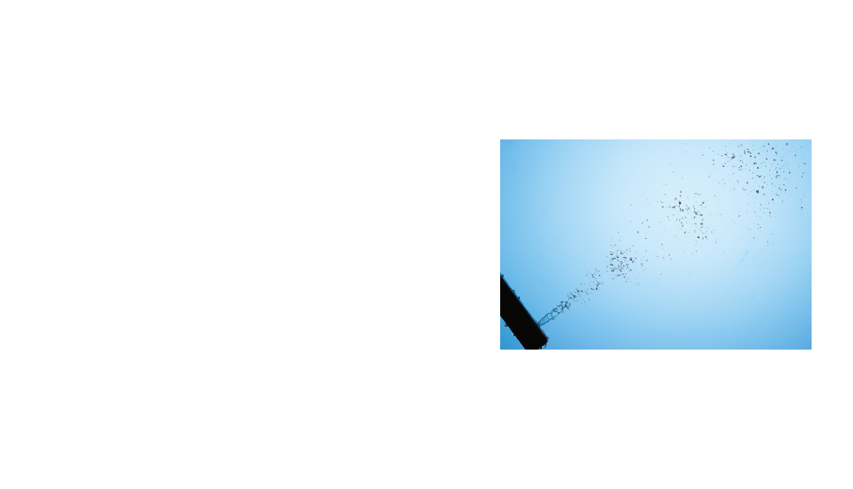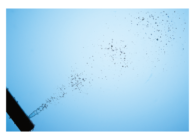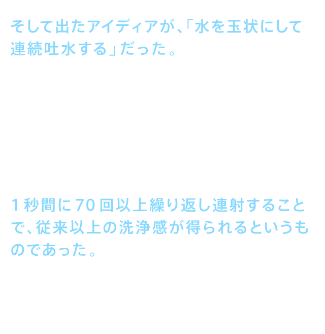 • そして出たアイディアが、「水を玉状にして連続吐水する」だった。これなら、少ない水量でもしっかりした洗浄感が得られるのではないか。なぜなら、水は連続的に当てるよりも、断続的に当てる方が応力が大きくなるからだ。開発チームは実証実験を繰り返し行った。それによって得られた結果は、強い吐水と弱い吐水を、交互に1秒間に70回以上繰り返し連射することで、従来以上の洗浄感が得られるというものであった。「ワンダーウェーブ洗浄」と名付けられたこの洗浄方式は、ウォシュレット®の洗浄技術を革命的に変えるものとなった。