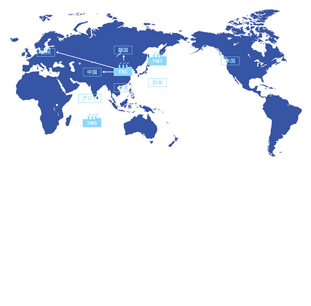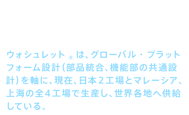 • 2016(平成28)年現在TOTOは、日本を含め、中国、アジア、米州、欧州など18の国と地域で事業を展開している。ウォシュレット®は、グローバル・プラットフォーム設計(部品統合、機能部の共通設計)を軸に、現在、日本2工場とマレーシア、上海の全4工場で生産し、世界各地へ供給している。