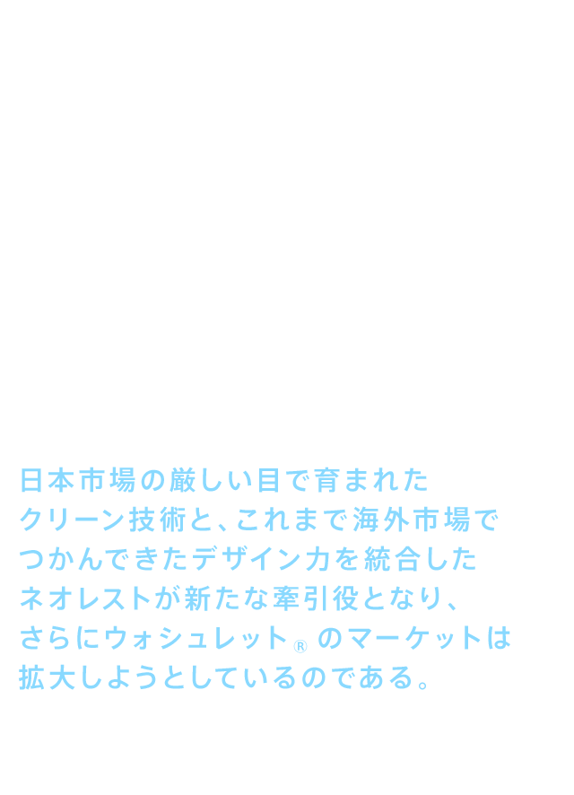 • ウォシュレット®は、おしりを洗うという機能を世に送り出した商品である。一方でTOTOは、セフィオンテクトやキレイ除菌水などの清潔機能、あるいは高度な節水技術によって便器の機能を高めてきた。ウォシュレット®と便器を一体化し、デザイン性を高めた商品がネオレストである。日本よりはるかにデザインが重視される海外において、ネオレストはその機能と優美なデザインにより、最高級ホテルやレジデンスに採用されている。つまり、日本市場の厳しい目で育まれたクリーン技術と、これまで海外市場でつかんできたデザイン力を統合したネオレストが新たな牽引役となり、さらにウォシュレット®のマーケットは拡大しようとしているのである。ウォシュレット®の存在感は、海外市場において確実に高まろうとしている。