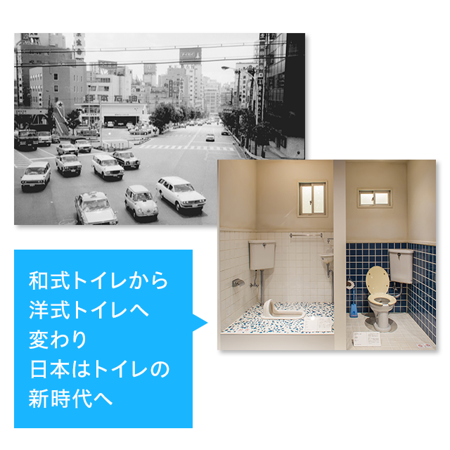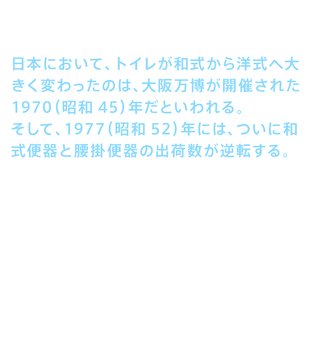 • またこの時代、日本のトイレは大きな転換点を迎えていた。日本において、トイレが和式から洋式へ大きく変わったのは、大阪万博が開催された1970(昭和45)年だといわれる。そして、1977(昭和52)年には、ついに和式便器と腰掛便器の出荷数が逆転する。その変化は便器のみにとどまらなかった。西洋人にとって便座が冷たいことは当たり前であったが、日本人の多くはこれを受け入れられずに便座カバーをかぶせ、さらには暖房便座という新たな需要を生み出したのである。こうしてトイレは用を足す「場所」から「空間」へと変わっていき、日本はトイレの新時代に突入するのである。