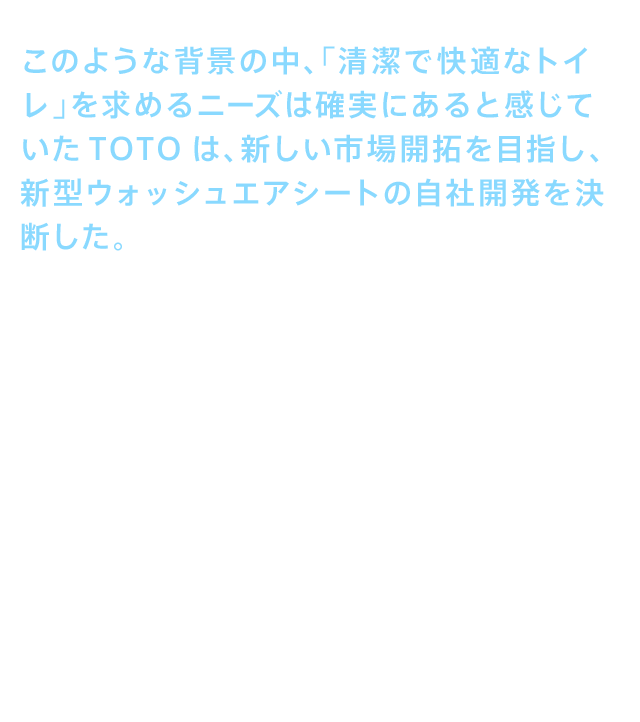 • このような背景の中、「清潔で快適なトイレ」を求めるニーズは確実にあると感じていたTOTOは、新しい市場開拓を目指し、新型ウォッシュエアシートの自社開発を決断した。TOTOでは通常、新商品の開発期間には3年が充てられていた。ところが、この前例のない商品の開発には、なんと1年半の時間しか与えられなかった。この過酷な試練を開発チームは乗り越え、ウォシュレット®は成功への道を踏み出すこととなる。それを可能にしたのは、20代を中心としたメンバーたちの気力と体力、そしてチームワークによるところが大きい。